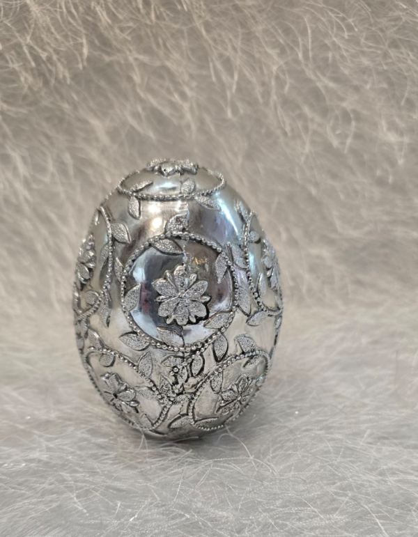 Εντυπωσιακά μεταλλικά αυγά σε ασημί απόχρωση με κομψά ανάγλυφα σχέδια, ιδανικά για εκλεπτυσμένη πασχαλινή διακόσμηση. Η μεταλλική τους υφή και οι λεπτομέρειες στο σχέδιο προσδίδουν πολυτέλεια και λάμψη σε κάθε χώρο.