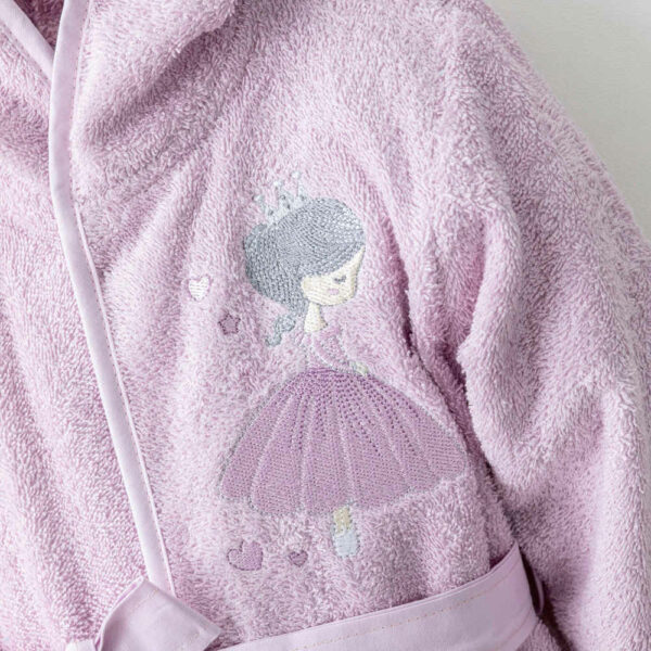 Διαθέτει κουκούλα για μεγαλύτερη προστασία, ζώνη μέσης για ασφαλές κλείσιμο και πρακτικές τσέπες. Το λιλά χρώμα του σε συνδυασμό με το κέντημα μπαλαρίνας-πριγκίπισσας και το περιμετρικό ρέλι στις λεπτομέρειες (μανίκια, τσέπες, ζώνη) χαρίζουν μια ξεχωριστή, κοριτσίστικη πινελιά.