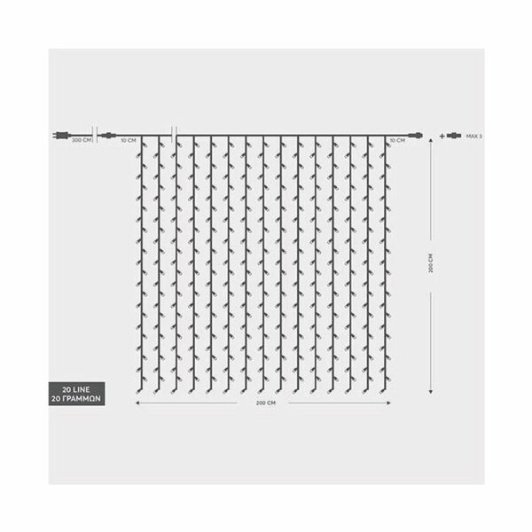 Δημιουργήστε εντυπωσιακή εορταστική ατμόσφαιρα με 360 LED τύπου κουρτίνα της Eurolamp. Με 20 σειρές LED, ψυχρό λευκό φωτισμό, διάφανο PVC καλώδιο και δυνατότητα επέκτασης έως 3 σειρές, είναι κατάλληλα για εσωτερική και εξωτερική χρήση (IP44). Ιδανικά για παράθυρα, μπαλκόνια και χριστουγεννιάτικες διακοσμήσεις.
