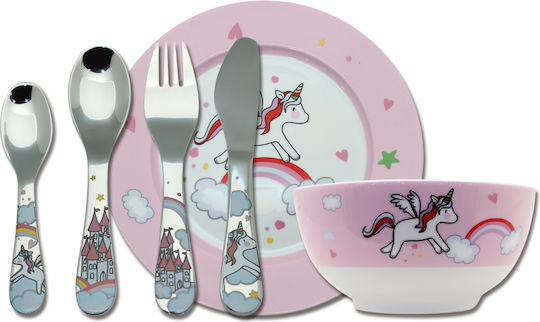 Χαρούμενο και πολύχρωμο σετ φαγητού Cryspo Trio Unicorn, κατασκευασμένο από πορσελάνη, ιδανικό για παιδιά. Το σετ 6 τεμαχίων περιλαμβάνει πιάτο, μπολ, φλιτζάνι και άλλα απαραίτητα κομμάτια για ένα πλήρες παιδικό γεύμα.