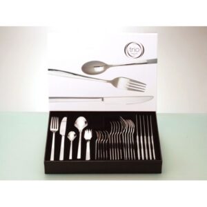 Πλήρες σετ μαχαιροπήρουνων της Cryspo Trio, σειρά Karma, κατασκευασμένο από υψηλής ποιότητας ανοξείδωτο ατσάλι (inox). Το σετ περιλαμβάνει 30 τεμάχια και καλύπτει όλες τις ανάγκες ενός πλήρους τραπεζιού, από καθημερινά γεύματα έως επίσημα δείπνα.