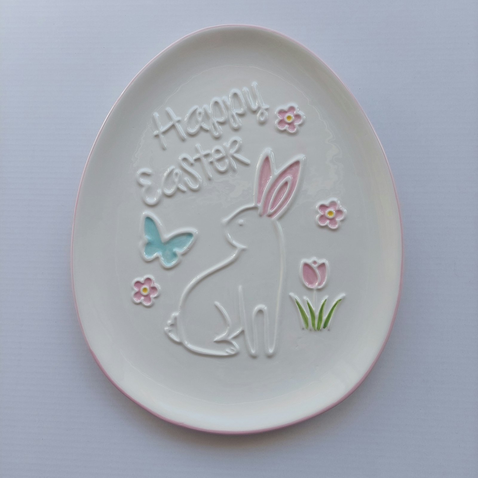 Όμορφο διακοσμητικό πασχαλινό πιάτο από κεραμικό υλικό, διακοσμημένο με χαριτωμένο λαγό. Ιδανικό για να προσθέσει γιορτινή και ανοιξιάτικη ατμόσφαιρα στο πασχαλινό τραπέζι ή στη διακόσμηση του σπιτιού.