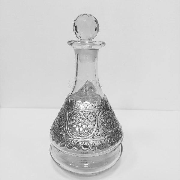 Κομψή γυάλινη καράφα της Inart, διαστάσεων 29x12cm, με ασημί μεταλλικές λεπτομέρειες που προσδίδουν πολυτελή και μοντέρνα αισθητική. Ιδανική για σερβίρισμα νερού, κρασιού ή χυμών, ενώ μπορεί να χρησιμοποιηθεί και ως εντυπωσιακό διακοσμητικό στοιχείο στο τραπέζι ή το μπαρ.