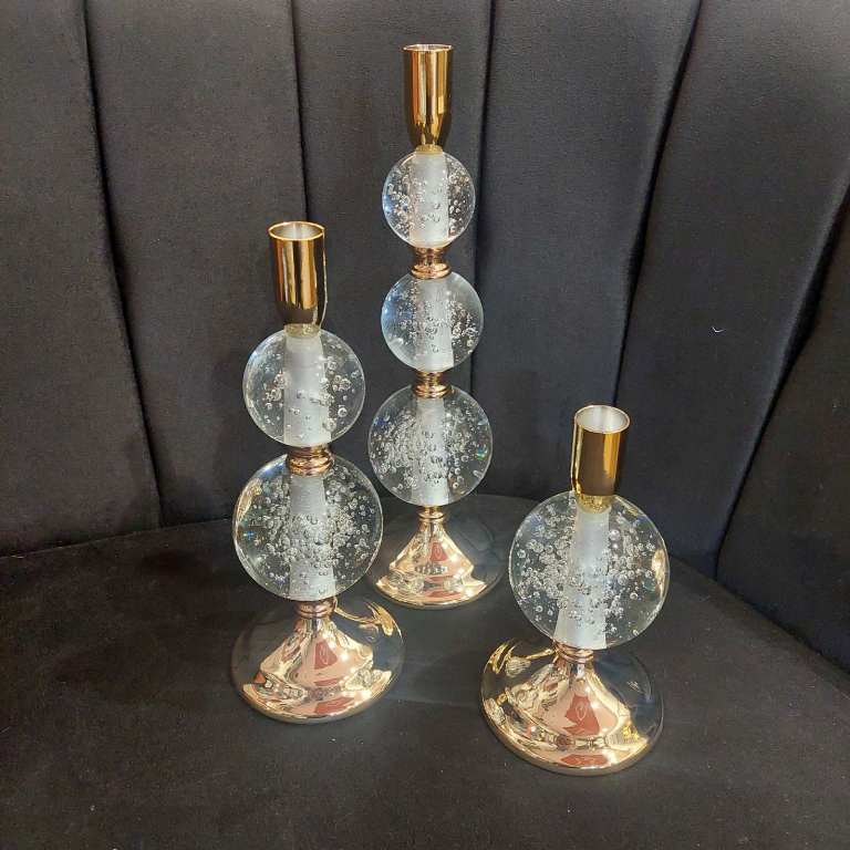 Αναδείξτε τη διακόσμηση του χώρου σας με αυτό το κομψό σετ μεταλλικών κηροπηγίων σε χρυσό και λευκό, διακοσμημένα με εντυπωσιακές γυάλινες σφαίρες. Το σετ περιλαμβάνει τρία μεγέθη, ιδανικά για συνδυαστική τοποθέτηση σε τραπεζάκι, μπουφέ ή κονσόλα.