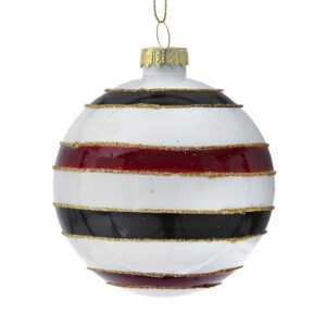 Εντυπωσιακή γυάλινη χριστουγεννιάτικη μπάλα σε κόκκινη και μαύρη ριγέ απόχρωση, με διάμετρο 10εκ. Ο δυναμικός χρωματικός συνδυασμός χαρίζει μοντέρνα και πολυτελή αίσθηση στο δέντρο σας, προσθέτοντας μια ξεχωριστή πινελιά στη γιορτινή σας διακόσμηση. Ιδανική για συνδυασμό με κλασικά ή σύγχρονα στολίδια.