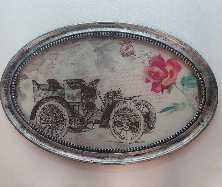 Διακοσμήστε τον χώρο σας με έναν εντυπωσιακό οβάλ πίνακα σε retro vintage αισθητική, που απεικονίζει αυτοκίνητο εποχής. Ο ιδιαίτερος σχεδιασμός του προσθέτει χαρακτήρα και νοσταλγική ατμόσφαιρα σε κάθε δωμάτιο, καθιστώντας τον ιδανικό για σαλόνι, γραφείο ή επαγγελματικό χώρο. Αποτελεί εξαιρετική επιλογή για λάτρεις της vintage διακόσμησης και των κλασικών οχημάτων.