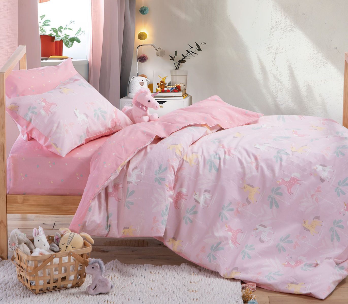 Σετ παιδικά μονά σεντόνια από την εταιρεία Nef-Nef σε ροζ απόχρωση με πολύχρωμες λεπτομέρειες και σχέδιο με μονόκερους.