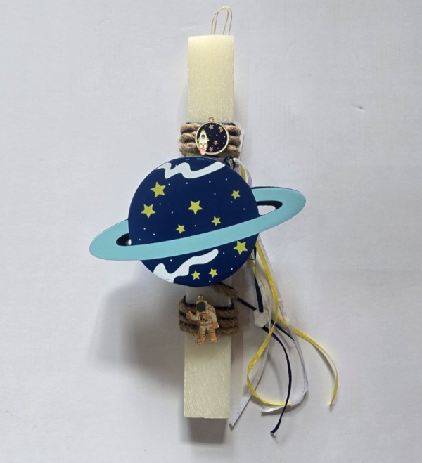 Εντυπωσιακή πασχαλινή λαμπάδα διακοσμημένη με θέμα αστροναύτη στη σελήνη, ιδανική για παιδιά και όσους αγαπούν το διάστημα. Ο πρωτότυπος σχεδιασμός της χαρίζει μια παιχνιδιάρικη και μοντέρνα πινελιά στο Πάσχα, ενώ το ύψος των 28 εκ. την καθιστά πρακτική και εύχρηστη για την Ανάσταση. Μια ξεχωριστή επιλογή που θα ενθουσιάσει μικρούς και μεγάλους.