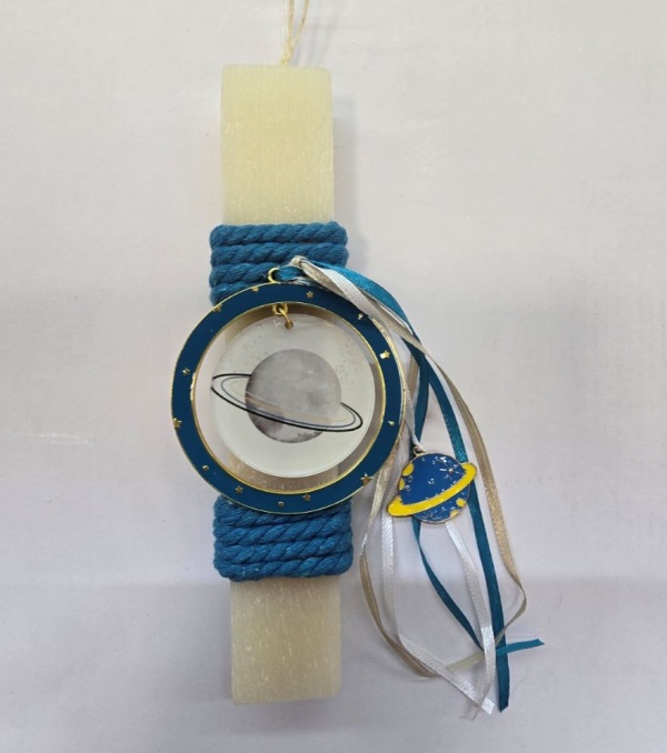 Πασχαλινή λαμπάδα με θέμα τον Κρόνο, ιδανική για παιδιά και ενήλικες που αγαπούν τη διαστημική θεματολογία και τους πλανήτες. Με ύψος 20 εκ., συνδυάζει παιχνιδιάρικο και εκπαιδευτικό στοιχείο, προσφέροντας μια ξεχωριστή και μοντέρνα επιλογή για το πασχαλινό καλάθι ή δώρο.
