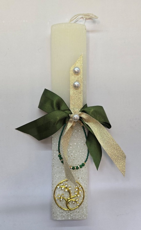 Κομψή πασχαλινή λαμπάδα διακοσμημένη με το σύμβολο του “Δέντρου της Ζωής” σε χρυσή απόχρωση, που αντιπροσωπεύει την αναγέννηση, την ελπίδα και τη συνέχιση της ζωής. Με ύψος 25,5 εκ., αποτελεί μια ξεχωριστή επιλογή για πασχαλινό δώρο ή για να προσθέσετε μια elegant πινελιά στο καλάθι της Ανάστασης.