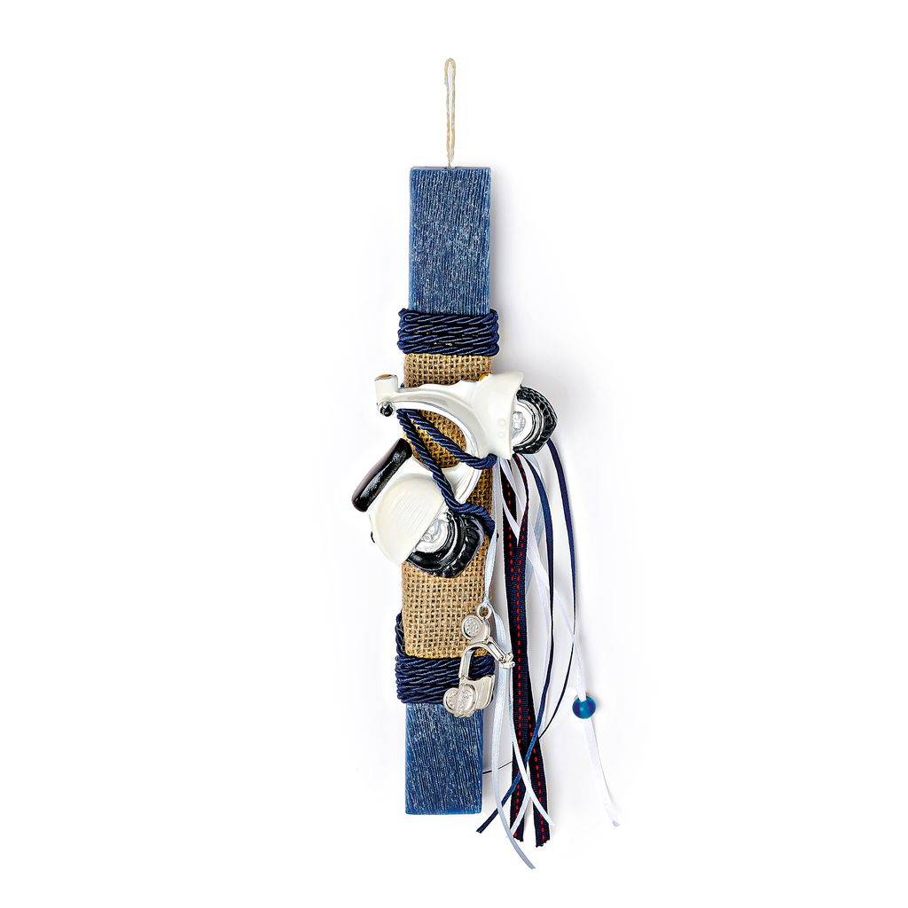 Πασχαλινή λαμπάδα διακοσμημένη με κεραμική λευκή βέσπα, ιδανική για πρωτότυπο πασχαλινό δώρο. Ο ιδιαίτερος σχεδιασμός την καθιστά κατάλληλη για παιδιά αλλά και ενήλικες, ενώ μετά το Πάσχα η κεραμική βέσπα μπορεί να χρησιμοποιηθεί ως διακοσμητικό.