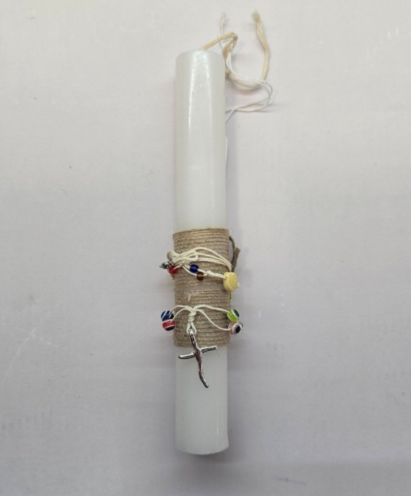 Κομψή πασχαλινή λαμπάδα διακοσμημένη με σταυρό και ματόχάντρα, ιδανική για όσους επιθυμούν να συνδυάσουν το θρησκευτικό στοιχείο με μια λεπτομερή διακόσμηση. Με ύψος 19 εκ., αποτελεί μια όμορφη και συμβολική επιλογή για το Πάσχα, προσφέροντας μια διακριτική αλλά ξεχωριστή αισθητική για το καλάθι της Ανάστασης ή ως δώρο.