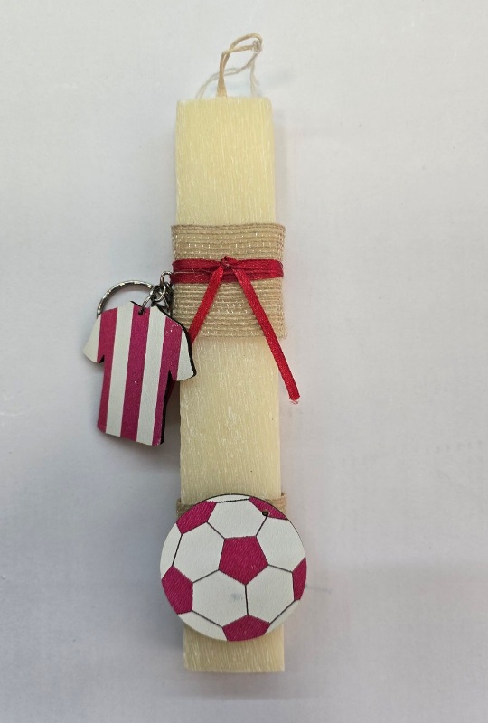 Πασχαλινή λαμπάδα με θέμα τον Ολυμπιακό, ιδανική για μικρούς και μεγάλους φιλάθλους της ομάδας. Με ύψος 20 εκ., αποτελεί μια πρωτότυπη και ξεχωριστή επιλογή για το πασχαλινό καλάθι ή δώρο, συνδυάζοντας αθλητικό πάθος και γιορτινή διάθεση.