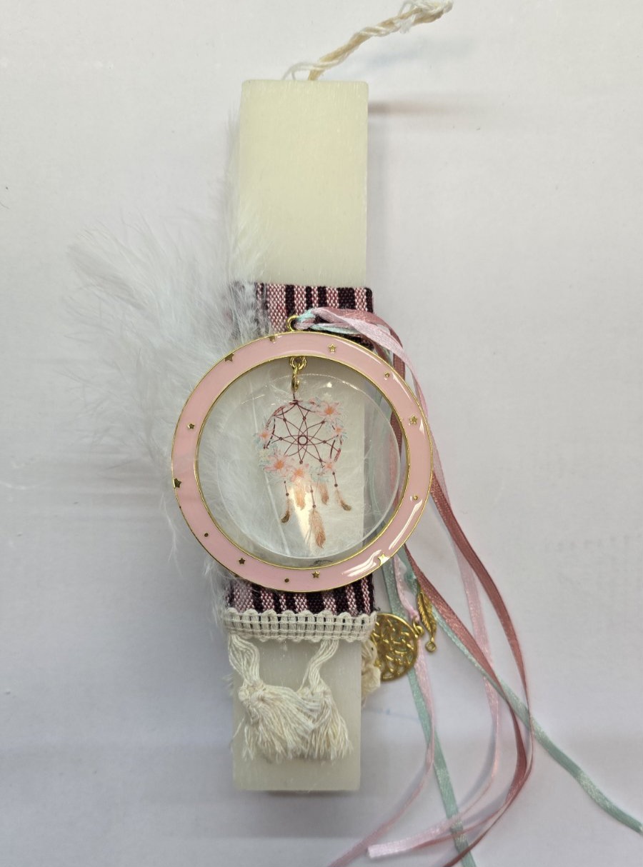 Χαριτωμένη και πρωτότυπη πασχαλινή λαμπάδα σε ροζ απόχρωση, διακοσμημένη με ονειροπαγίδα, ιδανική για μικρές πριγκίπισσες ή όσους αγαπούν τα girly και μαγικά σχέδια. Με ύψος 19 εκ., προσφέρει μια παιχνιδιάρικη και αισθητικά όμορφη πινελιά στο πασχαλινό καλάθι ή ως δώρο.