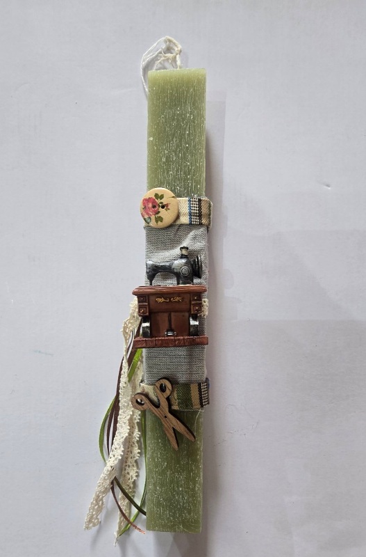 Ξεχωριστή πασχαλινή λαμπάδα διακοσμημένη με ραπτομηχανή, ιδανική για όσους αγαπούν τη δημιουργία, τη ραπτική και τις χειροτεχνίες. Ο ιδιαίτερος σχεδιασμός της χαρίζει κομψότητα και πρωτοτυπία, ενώ αποτελεί μια όμορφη επιλογή για πασχαλινό δώρο. Με ύψος 28 εκ., συνδυάζει εορταστικό ύφος και προσεγμένη αισθητική.