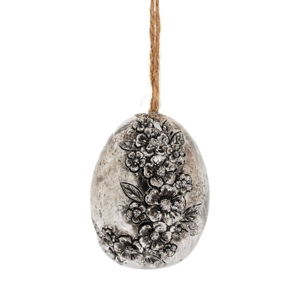 Κομψό πασχαλινό αυγό σε ασημί απόχρωση, κατασκευασμένο από polyresin, ιδανικό για εκλεπτυσμένη και λαμπερή διακόσμηση. Το μικρό του μέγεθος (5×7 εκ.) το καθιστά ιδανικό για κρέμασμα σε πασχαλινά δέντρα, γιρλάντες ή διακοσμητικές συνθέσεις.