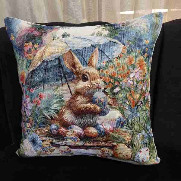 Χαριτωμένο πασχαλινό διακοσμητικό μαξιλαράκι με σχέδιο λαγού που κρατά ομπρέλα, ιδανικό για να προσθέσει γιορτινή και ανοιξιάτικη διάθεση στη διακόσμηση του σπιτιού. Με διαστάσεις 45x45cm είναι κατάλληλο για καναπέδες, πολυθρόνες ή κρεβάτια, δημιουργώντας μια ζεστή και χαρούμενη ατμόσφαιρα για την περίοδο του Πάσχα.