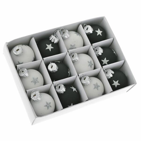 Δώστε μοντέρνα και κομψή πινελιά στο δέντρο σας με το σετ 12 μίνι γυάλινες χριστουγεννιάτικες μπάλες σε λευκό και μαύρο χρώμα, διακοσμημένες με αστέρια. Με διάμετρο 3 εκ., είναι ιδανικές για μικρά δέντρα, γιρλάντες, στεφάνια ή για να συμπληρώσουν τον στολισμό σε μεγαλύτερα δέντρα. Ο συνδυασμός λευκού-μαύρου με το σχέδιο αστεριών χαρίζει στυλ και μοναδικό χαρακτήρα στη χριστουγεννιάτικη διακόσμηση.