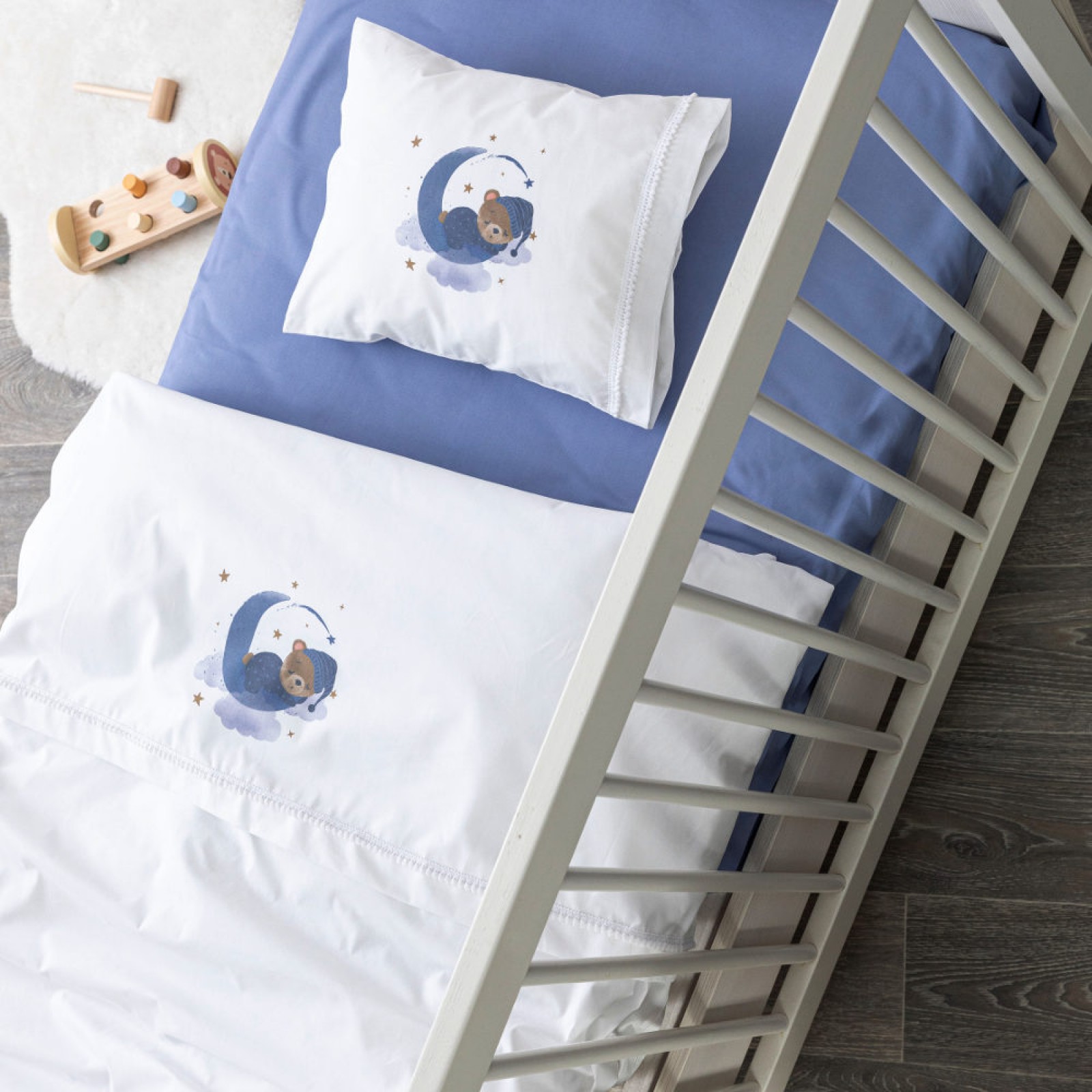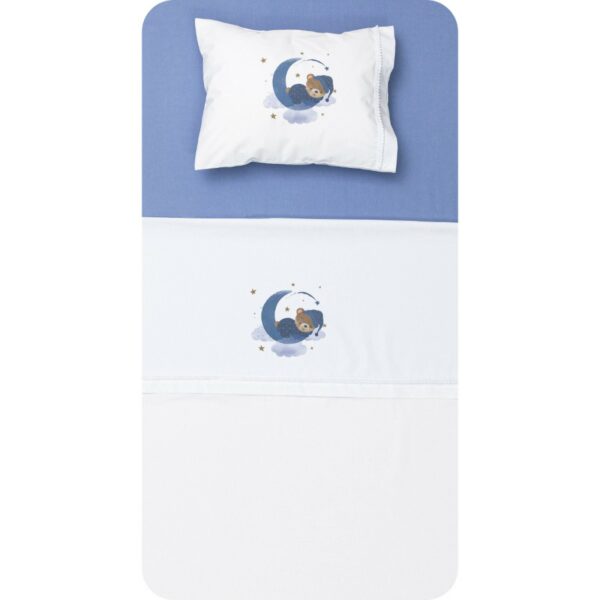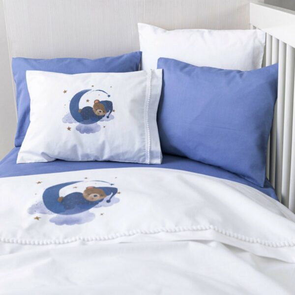 Το σετ περιλαμβάνει πανωσέντονο και μαξιλαροθήκη με ψηφιακή εκτύπωση σε χαριτωμένο σχέδιο «αρκουδάκι που κοιμάται», καθώς και μονόχρωμο μπλε κατωσέντονο. Διακοσμητική δαντέλα ολοκληρώνει το κομψό και τρυφερό στυλ.