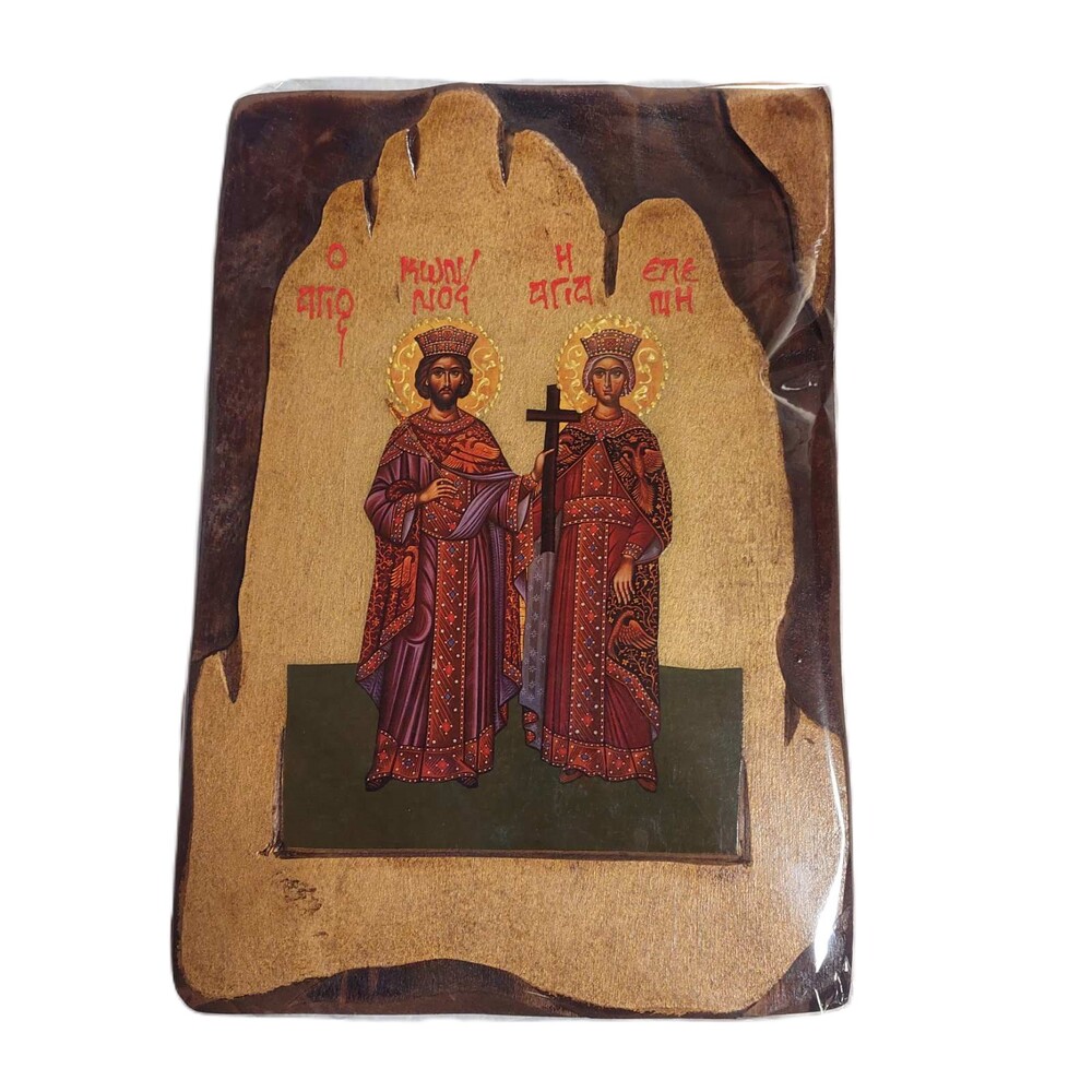 Ξύλινη εκκλησιαστική εικόνα με τον Άγιο Κωνσταντίνο και την Αγία Ελένη, προσφέροντας μια όμορφη και διαχρονική απεικόνιση των τιμημένων αυτών Αγίων της Ορθοδοξίας. Κατάλληλη για επιτραπέζια τοποθέτηση ή ανάρτηση σε τοίχο, η εικόνα αποτελεί ιδανικό δώρο για κάθε ορθόδοξο σπίτι ή εκκλησία.